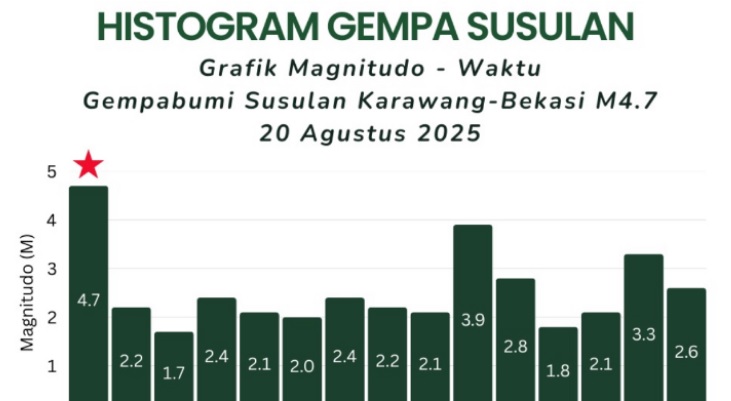 JABARTRUST.BANDUNG, – Badan Meteorologi, Klimatologi, dan Geofisika (BMKG) melaporkan hingga Kamis (21/8/2025) pukul 11.30 WIB, telah terjadi 14 kali gempa susulan dan dua gempa utama yang dirasakan menyusul peristiwa gempa berkekuatan magnitudo 4,9 yang mengguncang wilayah Kabupaten Bekasi dan Karawang, Jawa Barat, pada Rabu (20/8/2025) sekitar pukul 19.54 WIB.