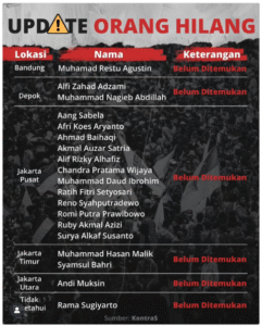 Hingga 1 September 2025, tercatat sekitar 23 orang yang masih belum berhasil ditemukan, dengan rincian wilayah meliputi 15 orang dari Jakarta Pusat, 2 orang dari Jakarta Timur, 2 orang dari Jakarta Utara, 1 orang dari Bandung, 1 orang dari Depok, dan 1 orang dengan asal yang tidak diketahui.